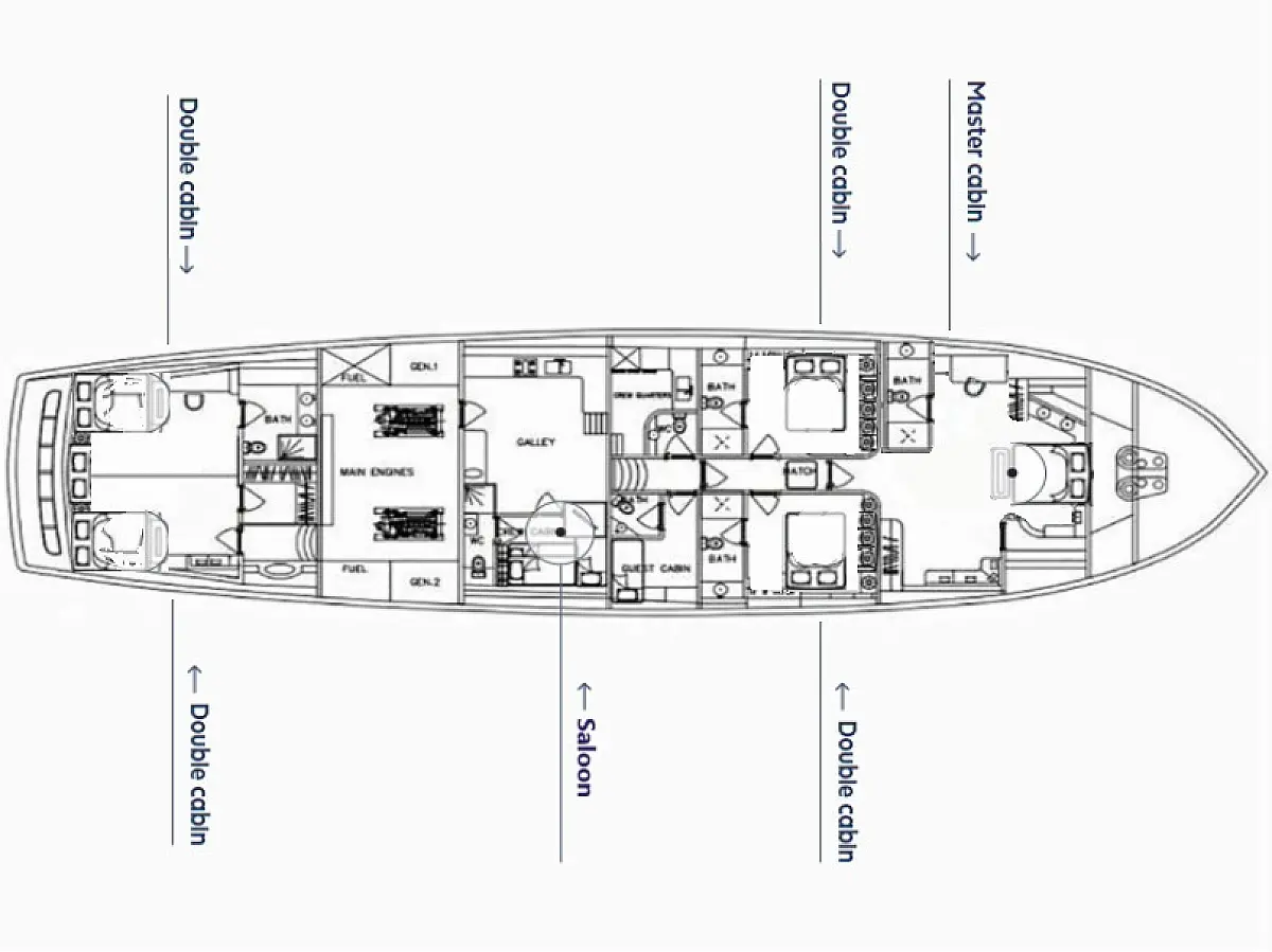 5 5 Cabins ; 1 Master, 2 VIP, 2 Double all en-suite.